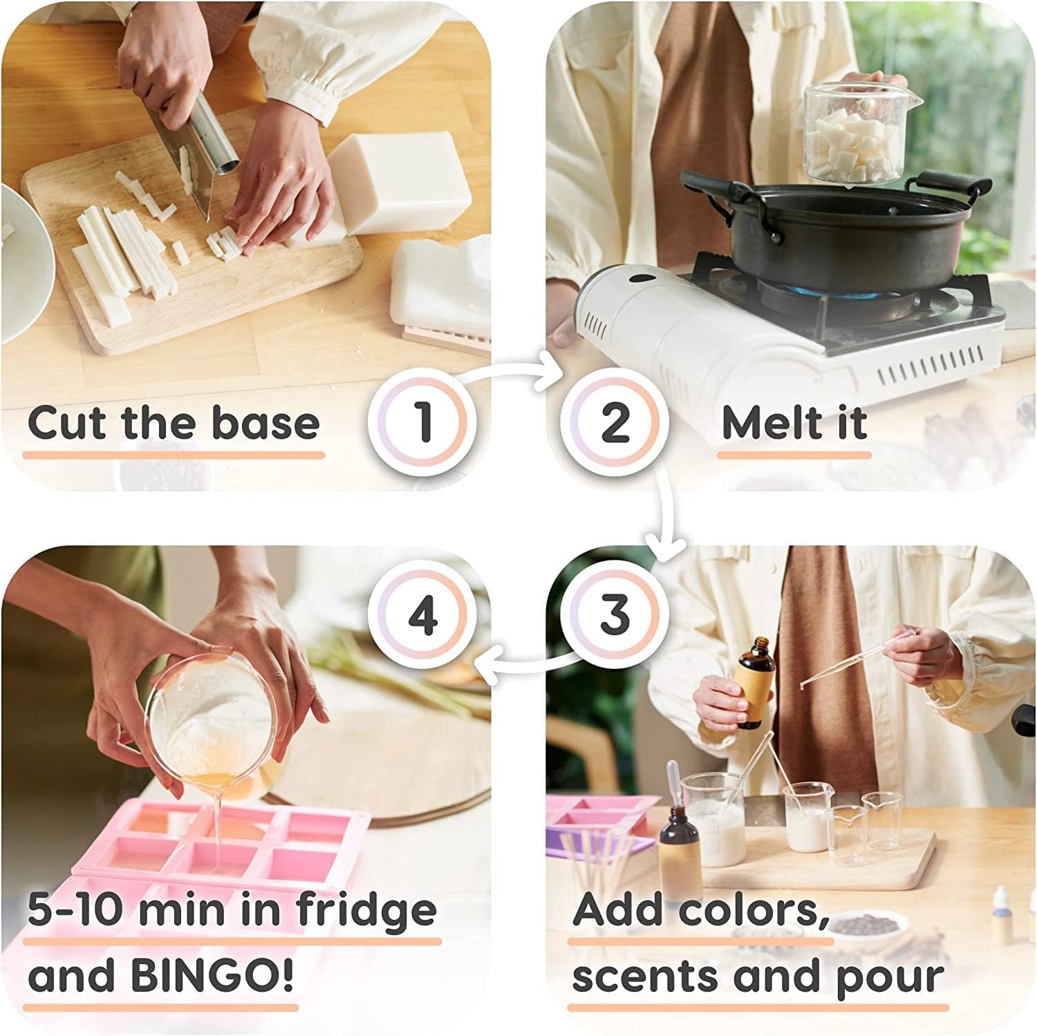 Coupez le bloc en petits morceaux, faites-le fondre au micro-ondes, puis versez-le dans des moules en ajoutant colorants et huiles essentielles si désiré.