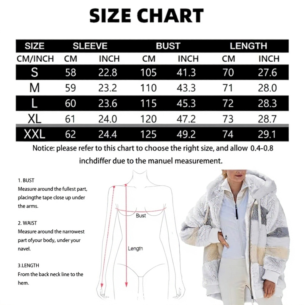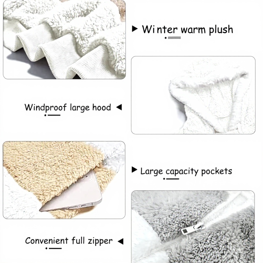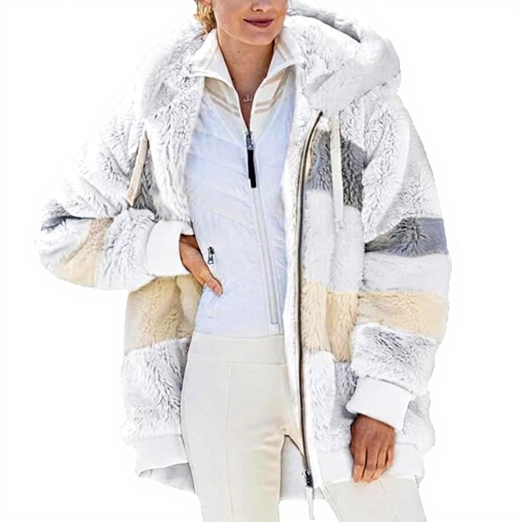 Le manteau est disponible en tailles S à XXL et dans une variété de couleurs comme le noir, le bleu, le vert, le violet, le kaki, le rose et le blanc. Fabriqué en matériau pelucheux, il est léger et facile à entretenir, avec une fermeture zippée pratique pour un ajustement sécurisé.